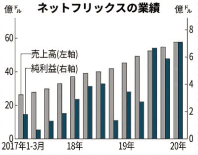 一方、ネットフリックスは株主への書簡で「自宅にとどまらなければいけない時期が終われば、会員数の伸びは鈍化する」と指摘した。新型コロナの影響で同社も3月半ばから大半の独自作品の撮影を中断しており、長引けば新作の数や配信スケジュールに響く可能性がある。ドル高によって海外事業の収益性も低下している。