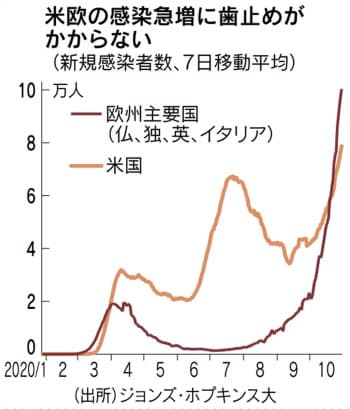 米欧で新型コロナウイルス感染者の拡大に拍車がかかっている。米ジョンズ・ホプキンス大の集計によると、米国の10月30日の1日当たり新規感染者数は9万9千人を超え、過去最多となった。11月3日に迫った米大統領選を前に、1カ月前の水準の2.4倍に増えた。欧州各国でも新規感染者数の過去最多の更新が相次いでいる。