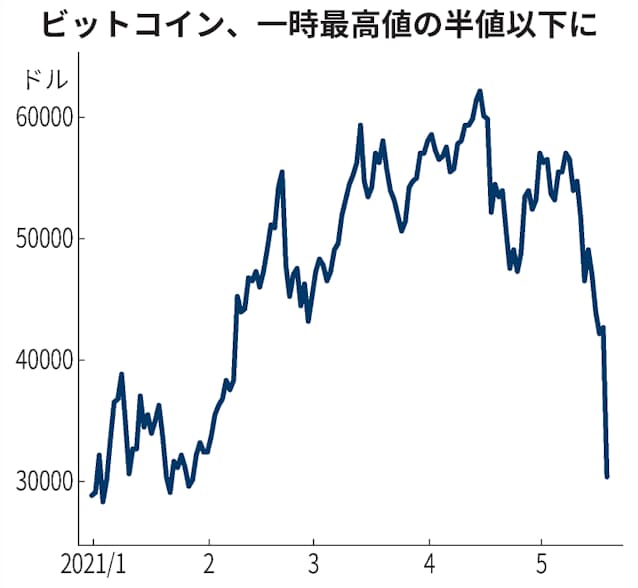 きっかけは中国の規制の動きだ。中国の銀行の業界団体などが18日付で金融機関に対し、仮想通貨の関連業務を禁じる通知を出した。12日には電気自動車テスラのイーロン・マスク最高経営責任者(CEO)がビットコインでの決済停止を表明するなど悪材料が重なった。短期筋の持ち高解消や投げ売りが膨らみ、下落の勢いが強まった。