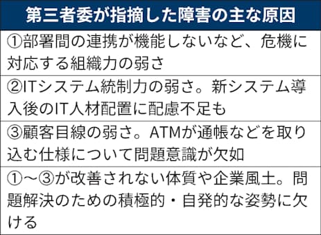 報告書は①危機に対応する組織力②IT(情報技術)システムの統制力③顧客目線――の3つの弱さを挙げ、経営陣に早急な改善を求めた。過去に2度のシステム障害を起こした経緯を踏まえ、脆弱な組織力が根本的に改善されずに「体質として根付いている可能性を否定できない」とした。