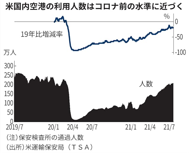 米運輸保安局(TSA)によると米国内空港の保安検査所の通過人数は7月に入り、7日移動平均で前年比2割減の水準まで回復した。ユナイテッドは旅客不足で貨物専用に回していた便の大半を21年中に旅客向けに戻す。