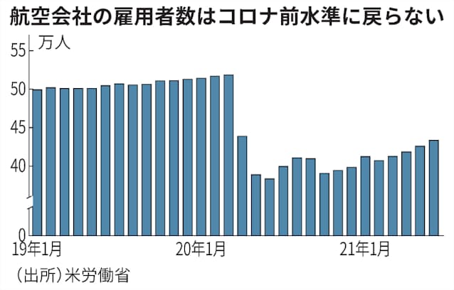 「フライトを終え、法定休息時間を過ぎた途端に次のフライトの電話がかかってくる」。コロナ下での無給休暇を終え、現場に復帰したある大手航空会社の客室乗務員は人手不足を実感している。米労働省によると航空業界の雇用者数は6月時点で43万人と、コロナ前の約8割にとどまったままだ。