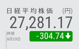 19日の東京株式市場で日経平均株価は反落し、前日比304円74銭(1.10%)安の2万7281円17銭で終えた。1月6日以来、約7カ月半ぶりの安値となった。7月の米連邦公開市場委員会(FOMC)議事要旨が年内のテーパリング(量的金融緩和の縮小)開始を示唆する内容だったことから、緩和マネーに支えられた株式相場には下落圧力がかかるという見方が広がった。前日の米株式相場に続いてアジア株も軟調に推移し、相場の重荷になった。