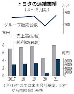 トヨタ自動車が4日発表した2021年4~6月期の連結決算(国際会計基準)は、純利益が前年同期比5.7倍の8978億円だった。新型コロナウイルスが広がる前の19年4~6月期の6829億円を超え、4~6月期としては最高となった。コロナの影響が続く中で新車の需要が回復。北米や中国、日本といった世界の主要市場で販売が増えた。車業界の半導体不足の影響も限定的にとどめた。