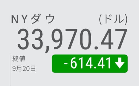 【ニューヨーク=大島有美子】20日の米株式市場でダウ工業株30種平均は前週末比614ドル41セント(1.8%)安の3万3970ドル47セントで終えた。米景気の先行き不安や米連邦準備理事会(FRB)の量的緩和縮小の見通しで様子見ムードが強まっていた。中国の不動産大手、中国恒大集団の資金繰り懸念が広がったことで、投資家のリスク回避姿勢に拍車をかけた。