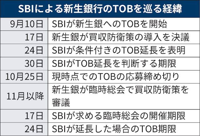TOBの期間は10月25日までで、SBIは新生銀株の最大48%を取得することをめざしている。新生銀はTOBへの賛否を「留保」したうえで、期間を12月8日まで延長するよう要請していた。