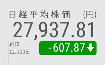 20日の東京株式市場で日経平均株価は大幅続落し、大引けは前週末比607円87銭(2.13%)安の2万7937円81銭だった。下げ幅は11月26日(747円66銭)以来の大きさ。終値で心理的な節目の2万8000円を6日以来、2週間ぶりに下回った。前週末の米国株安を受け、運用リスクを回避する目的の売りが先行した。日本時間午前に中国人民銀行(中央銀行)の利下げが伝わると、中国景気の先行き懸念から売り圧力が一段と強まり、下げに拍車がかかった。