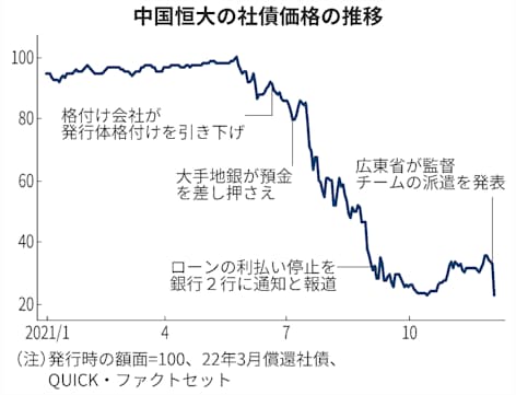 恒大はこれまで猶予期限切れの直前に利払いを実行するなどして、デフォルトをかろうじて回避してきた。私募債を保有するとみられる投資家から債務保証の履行を求められるなど、資金繰りの厳しさが増していた。
