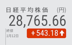 12日の東京株式市場で日経平均株価は4営業日ぶり反発し、前日比543円18銭(1・92%)高の2万8765円66銭で終えた。前日の米株式市場で主要株価指数がそろって上昇した流れを受け、東京市場でも主力銘柄への買いが優勢になった。アジアの株式相場が堅調に推移したのも追い風となり、取引終了にかけて日経平均は一段高となった。