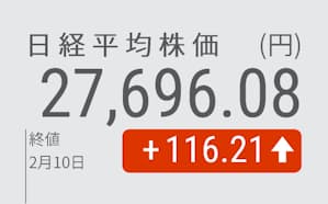 10日の東京株式市場で日経平均株価は3日続伸し、前日比116円21銭(0・42%)高の2万7696円08銭で終えた。1月20日以来3週間ぶりの高値。朝方は幅広い銘柄に買いが先行したが、その後は利益確定や戻り待ちの売りがかさんで伸び悩んだ。