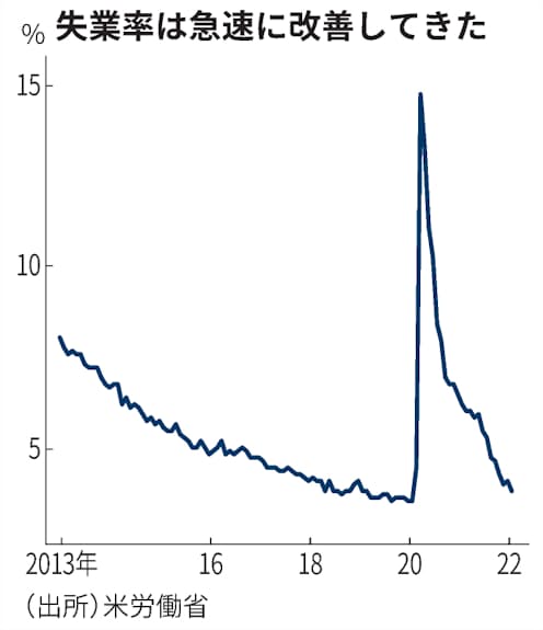 失業率は新型コロナウイルス禍が実体経済に影響を及ぼす前の2020年2月の時点で3.5%と、約50年ぶりの低水準だった。同年4月には14.7%まで跳ね上がったが、再び戻りつつある。働きたい人がほぼ全員仕事に就くことができる「完全雇用」に達しつつある。