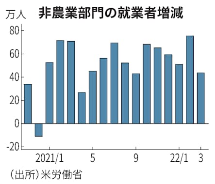 【ワシントン=高見浩輔】米労働省が1日発表した3月の雇用統計によると、非農業部門の就業者数は前月から43万1000人増えた。増加幅は前月の75万人から縮小した。失業率は前月の3.8%から低下し、3.6%となった。賃金上昇がインフレの加速を招けば、ウクライナ危機下でも米連邦準備理事会(FRB)が利上げペースを速める可能性がある。
