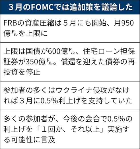 【ワシントン=高見浩輔】米連邦準備理事会(FRB)は6日、3月15~16日に開いた米連邦公開市場委員会(FOMC)の議事要旨を公開した。量的引き締め(QT)と呼ばれる資産圧縮について、すべての参加者が「早ければ5月の次回会合でプロセスを開始するのが適切だろう」と指摘した。月に950億ドル(約11.7兆円)を上限として縮小することでおおむね合意した。