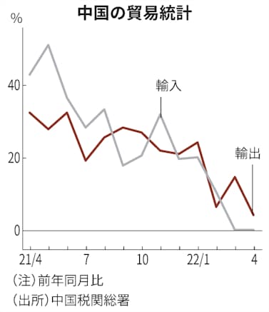 輸出を品目別にみると、パソコンなどが5%減った。3月まで1割前後伸びていたが、失速した。ウイルスを徹底して抑え込む中国政府の「ゼロコロナ規制」で、サプライチェーン(供給網)が乱れ、生産や出荷に支障が出た可能性がある。