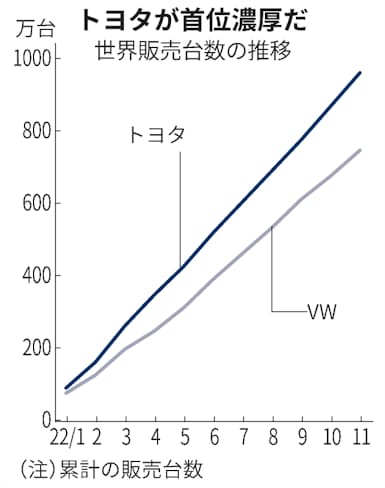 ダイハツ工業と日野自動車を含むトヨタグループ全体の11月単月の世界販売は88万台と前年同月比で4%伸びた。一方、VWは9%増の67万台だった。トヨタを逆転して首位に立つには22年の月間平均販売の3倍を超える台数が12月だけで必要になる計算だ。トヨタ単体(トヨタ・レクサスブランド)だけでもVWを上回りそうだ。