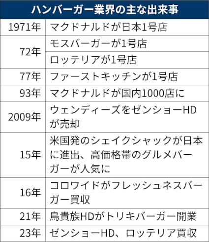バーガー業界は2000年代以降、競争は激しくなっている。客単価が1人1000円を超える個人経営のグルメバーガー店も増え、15年には米シェイクシャックが進出した。フレッシュネスバーガーをコロワイドが傘下に収め、鳥貴族ホールディングスが「トリキバーガー」を出店するなど参入も相次いでいる。