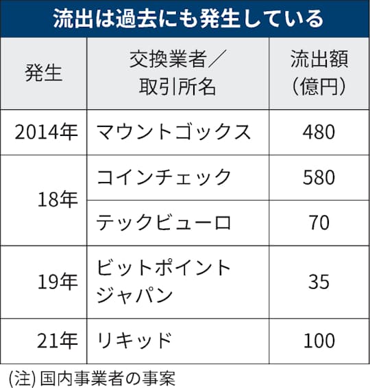 暗号資産交換業者からの仮想通貨の流出事案は過去にも複数回発生している。14年にマウントゴックスから480億円、18年にはコインチェックから580億円が流出した。21年にリキッドから100億円が流出して以降は国内交換業者からの流出事案は発生していなかった。金融庁が交換業者に業務改善命令を出した事例もある。